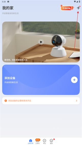 1、打開(kāi)v380的應(yīng)用軟件,進(jìn)入首頁(yè)點(diǎn)擊右上方+的圖標(biāo)。