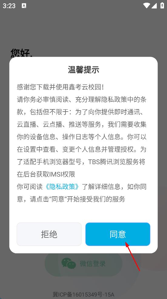1、打開鑫考云校園APP,出現(xiàn)溫馨提示彈窗,仔細(xì)閱讀內(nèi)容后,點(diǎn)擊同意按鈕。