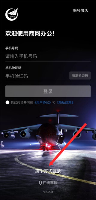 1、打開商網(wǎng)辦公APP,在登錄的界面,我們點(diǎn)擊換個(gè)方式登錄。