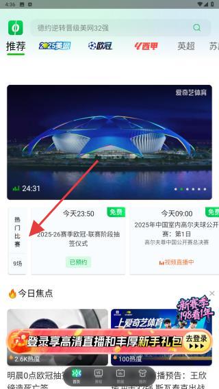 1、打開app進(jìn)入到首頁內(nèi),在推薦下方點擊熱門比賽按鈕,點擊可跳轉(zhuǎn)頁面。