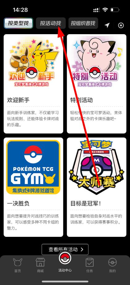 2、在活動(dòng)中心界面,點(diǎn)擊按活動(dòng)找選項(xiàng),切換到按活動(dòng)查找的頁(yè)面。