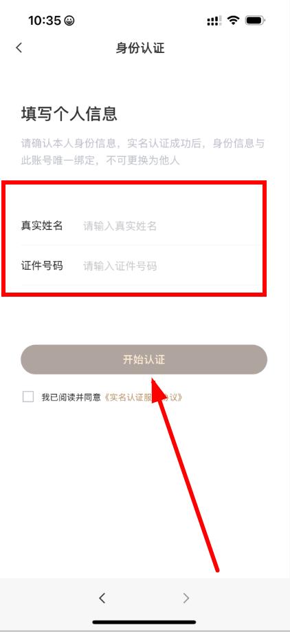 4、在填寫(xiě)個(gè)人信息界面,輸入真實(shí)姓名和證件號(hào)碼,勾選同意相關(guān)協(xié)議后,點(diǎn)擊開(kāi)始認(rèn)證,按照后續(xù)提示完成實(shí)名認(rèn)證。