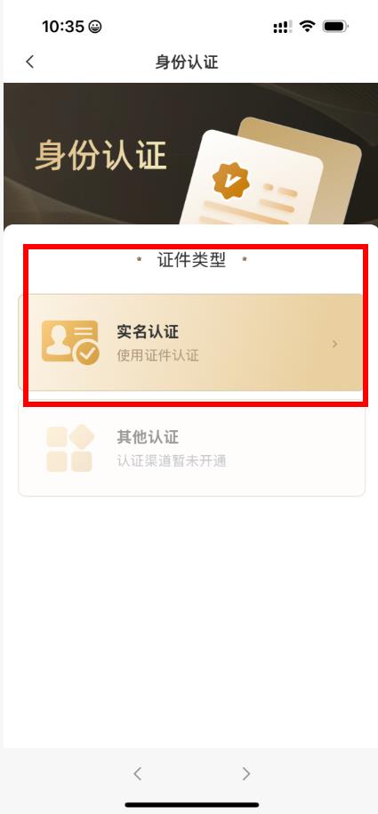 3、在身份認(rèn)證頁(yè)面,選擇實(shí)名認(rèn)證這一選項(xiàng)。