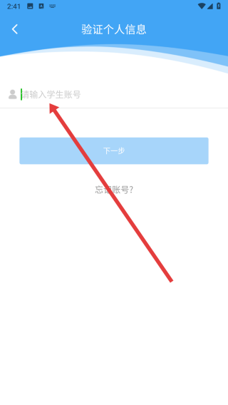 4、在進(jìn)入到驗(yàn)證個人信息頁面中,點(diǎn)擊輸入框填寫學(xué)生賬號進(jìn)行找回操作。