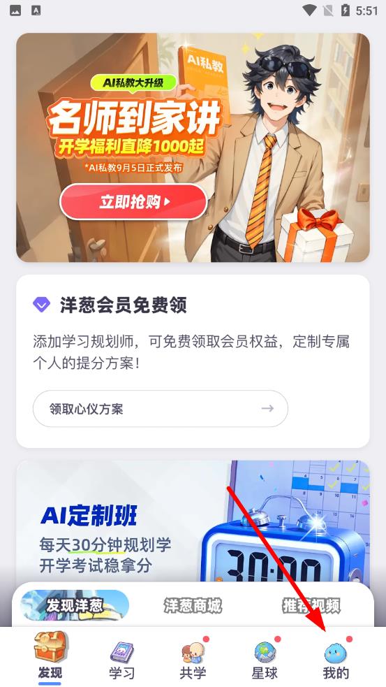 1、打開洋蔥學(xué)園應(yīng)用,點(diǎn)擊底部導(dǎo)航欄最右側(cè)的我的選項(xiàng)進(jìn)入個(gè)人中心頁(yè)面。