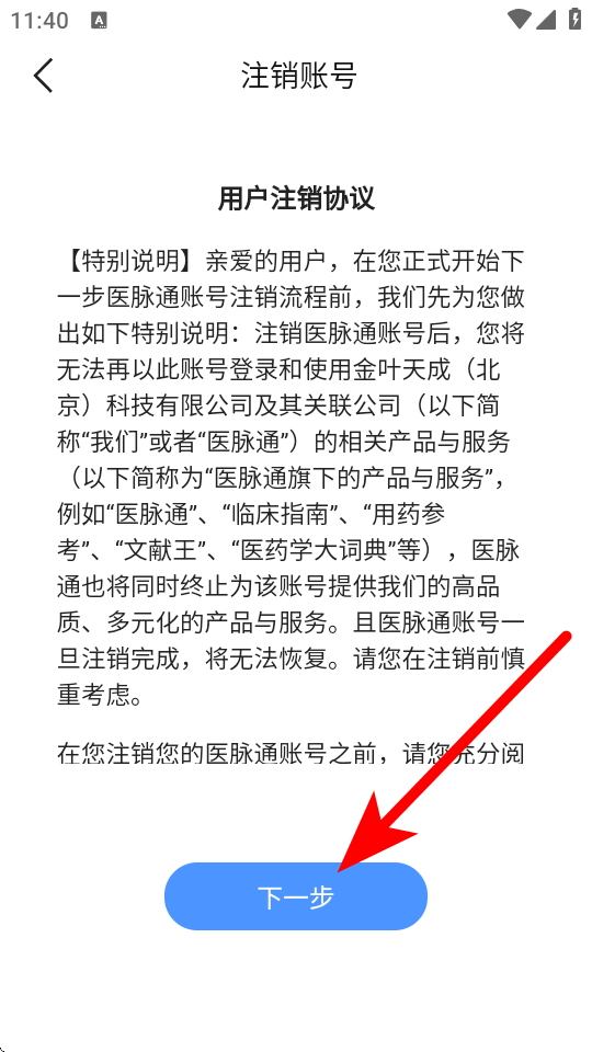 3、在說明頁面,閱讀協(xié)議后點擊下一步,進入注銷原因選擇頁面。