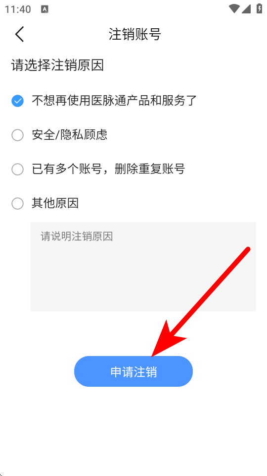 4、在原因選擇頁面,選擇原因后點擊申請注銷,完成賬號注銷操作。
