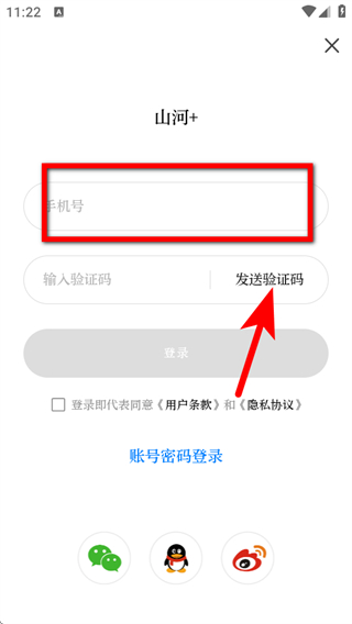 2、在登錄頁(yè)面,輸入手機(jī)號(hào)并點(diǎn)擊發(fā)送驗(yàn)證碼。