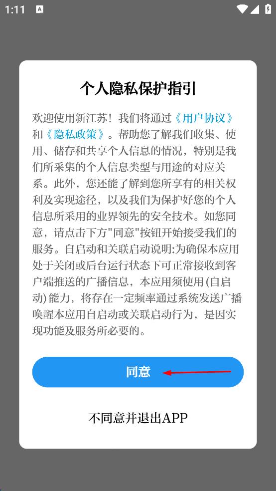 1、打開會(huì)計(jì)教練APP,在彈出的服務(wù)協(xié)議和隱私政策提示框中,點(diǎn)擊我同意按鈕。