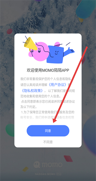 1、在陌陌APP的“用戶協(xié)議與隱私權(quán)政策”彈窗點(diǎn)擊“同意”,進(jìn)入登錄界面。