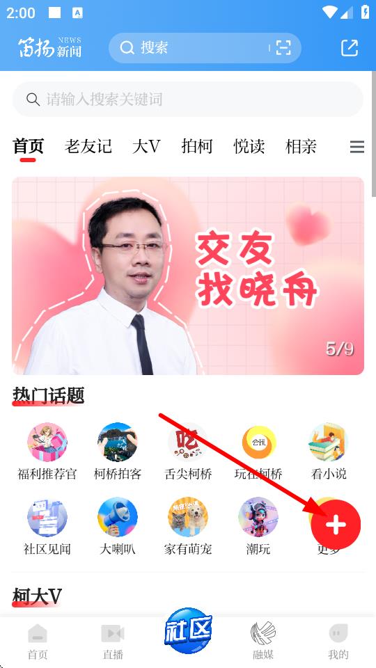 1、打開笛揚新聞APP,在社區(qū)頁面點擊右側(cè)紅色加號按鈕。