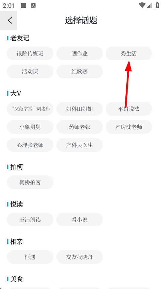3、在話題選擇頁面,挑選合適的話題,如秀生活。