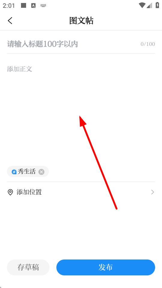 4、進入圖文帖編輯頁面,輸入標題100字以內(nèi)和正文內(nèi)容,還可添加位置信息,完成后點擊發(fā)布即可。
