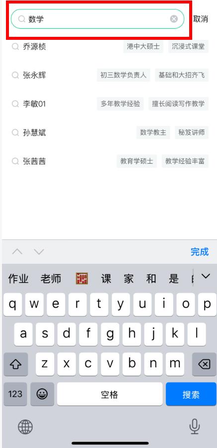 2、在彈出鍵盤(pán)界面,輸入想要搜索的課程關(guān)鍵詞如數(shù)學(xué),或者老師姓名如張茜茜,點(diǎn)擊搜索。