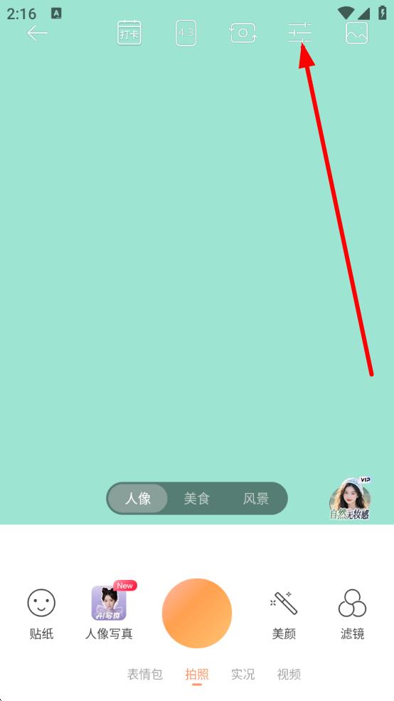 1、打開(kāi)無(wú)他相機(jī)進(jìn)入拍照界面,點(diǎn)擊屏幕上方像三條橫線疊加的設(shè)置按鈕,進(jìn)入拍攝設(shè)置頁(yè)面。