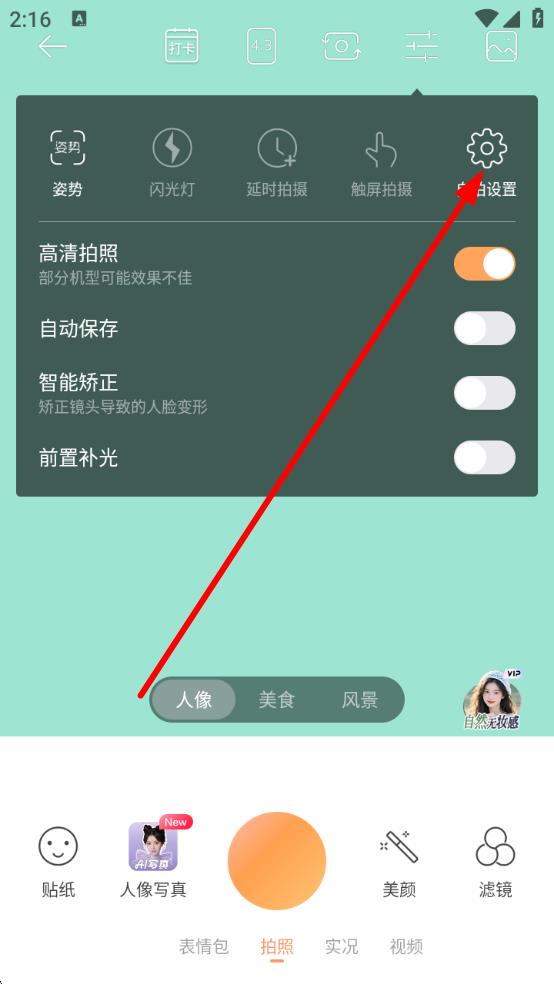 2、在拍攝設(shè)置頁(yè)面中,點(diǎn)擊右上角齒輪狀的拍攝設(shè)置選項(xiàng),進(jìn)入更詳細(xì)的設(shè)置界面。