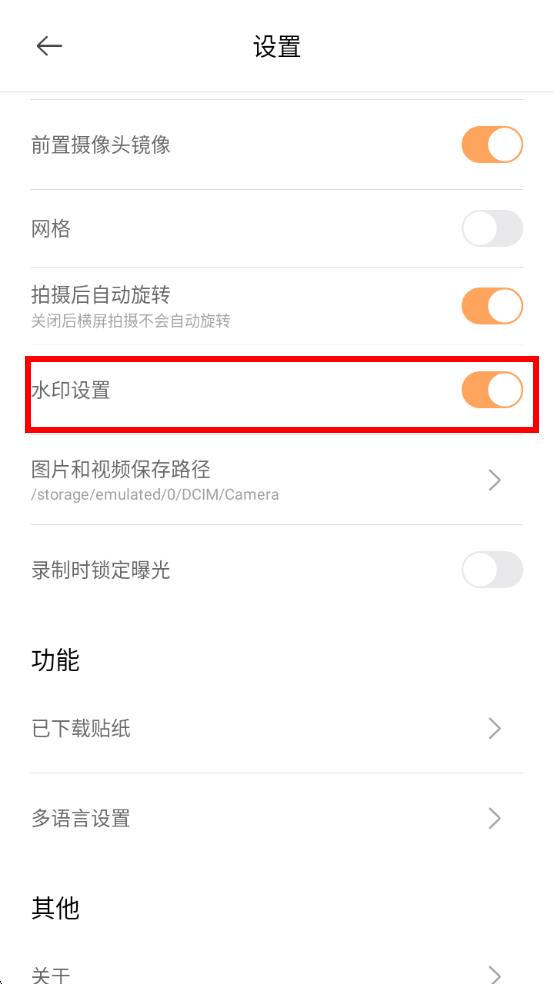 3、在詳細(xì)設(shè)置界面里,找到水印設(shè)置選項(xiàng),點(diǎn)擊關(guān)閉其右側(cè)的按鈕,即可在拍攝時(shí)去除無(wú)他相機(jī)水印。