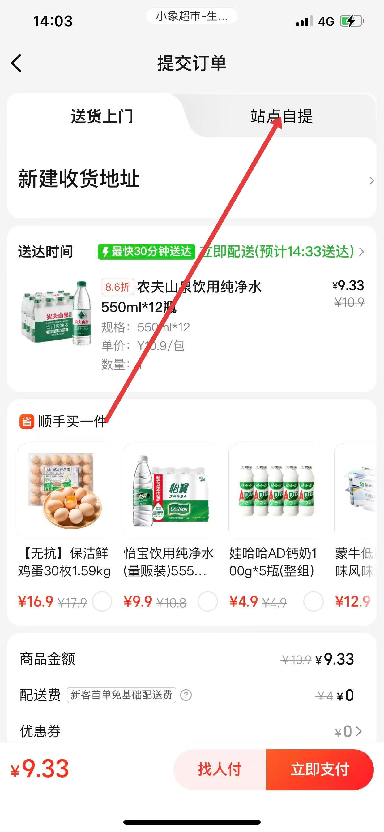 1、進(jìn)入提交訂單頁面,點擊上方的站點自提選項。