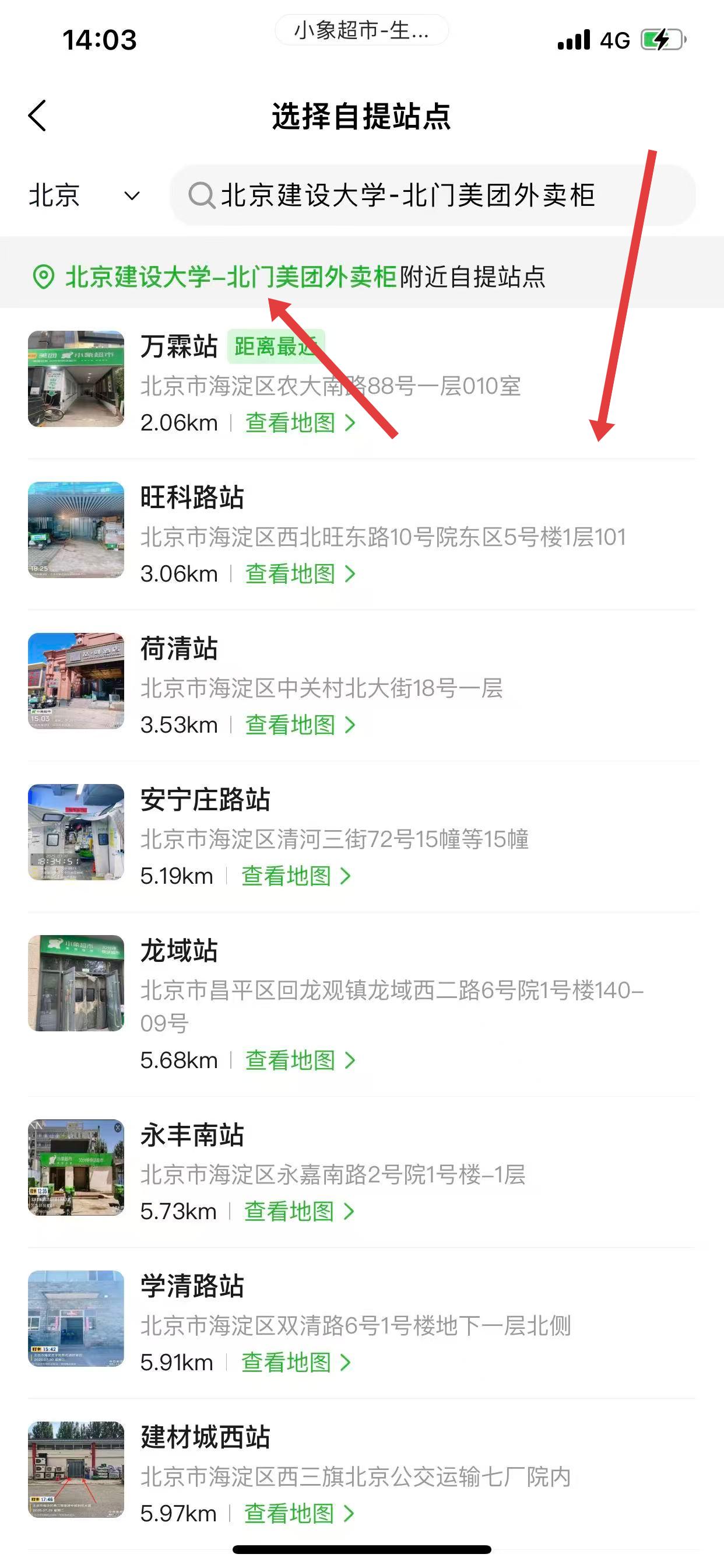 2、點擊切換,進(jìn)入選擇自提站點頁面,在該頁面搜索或選擇合適的自提站點,如萬霖站。