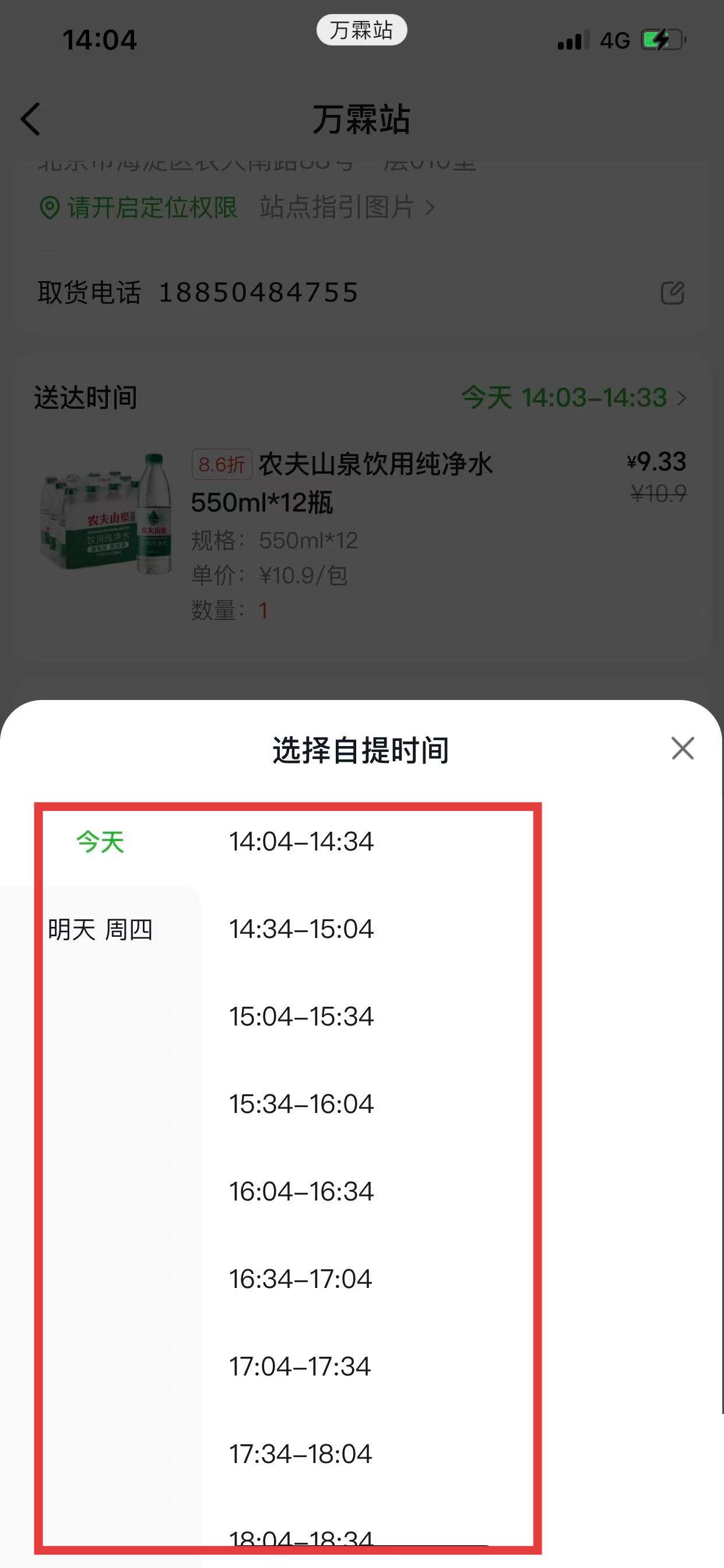 3、選擇好自提站點后,點擊送達(dá)時間,在彈出的時間選擇框里,選擇適合自己的自提時間。
