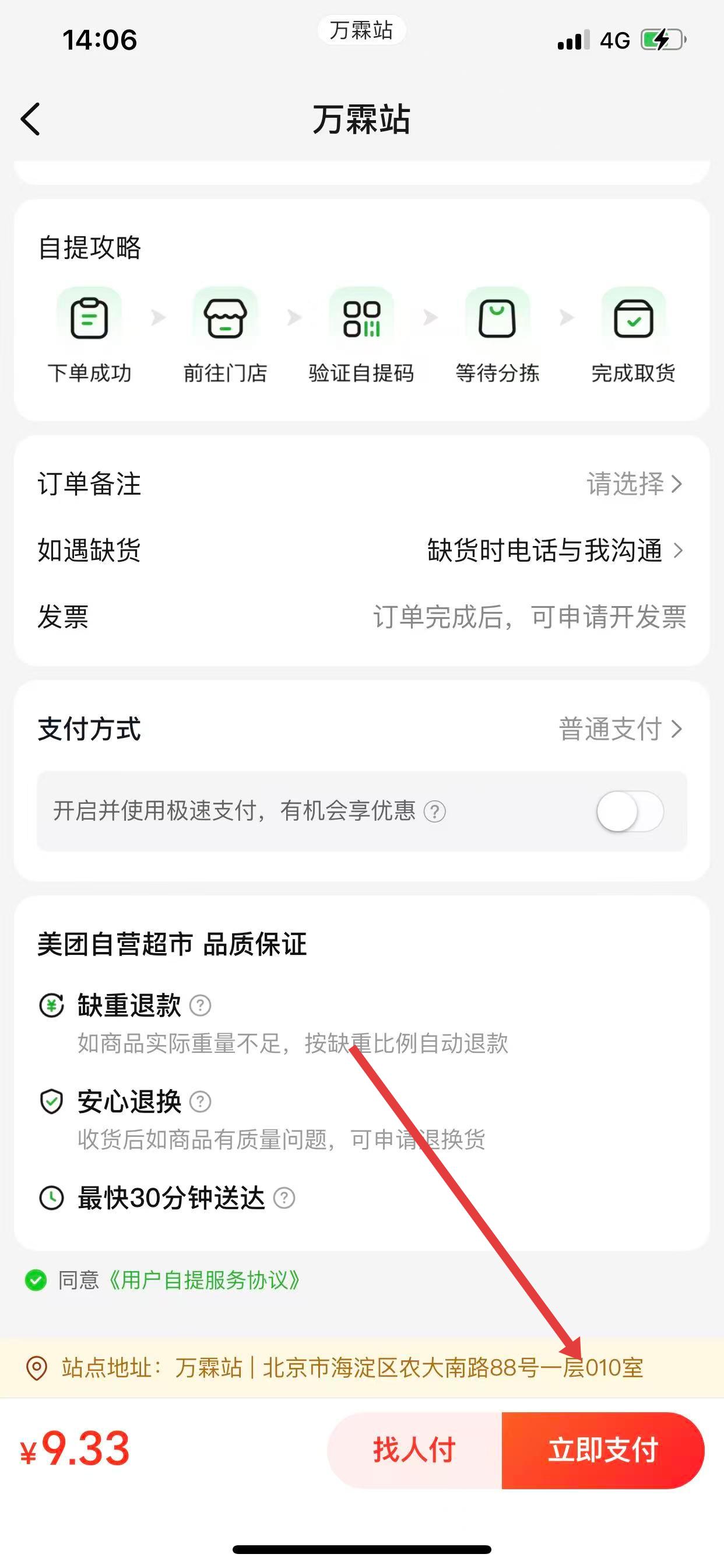 4、點擊立即支付,完成付款,后續(xù)在所選時間前往自提站點取貨即可。
