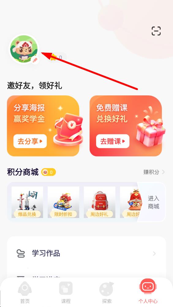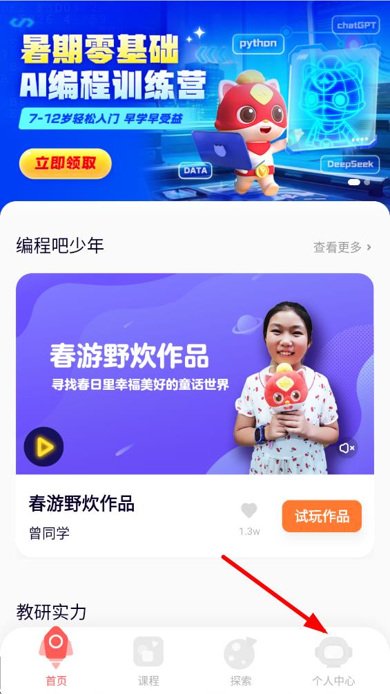 1、打開探月少兒編程app,點擊底部導航欄中的個人中心選項,進入個人中心頁面。