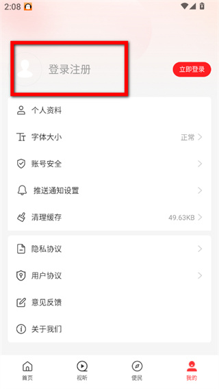 2、在個(gè)人中心頁(yè),點(diǎn)擊登錄注冊(cè)區(qū)域,進(jìn)入免密登錄頁(yè)面。