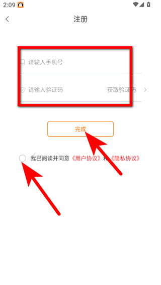 4、輸入手機(jī)號(hào)和驗(yàn)證碼,勾選同意后點(diǎn)擊完成按鈕,即可完成賬號(hào)注冊(cè)操作。