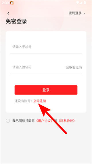 3、在免密登錄頁(yè)面,點(diǎn)擊立即注冊(cè)選項(xiàng),進(jìn)入注冊(cè)頁(yè)面。
