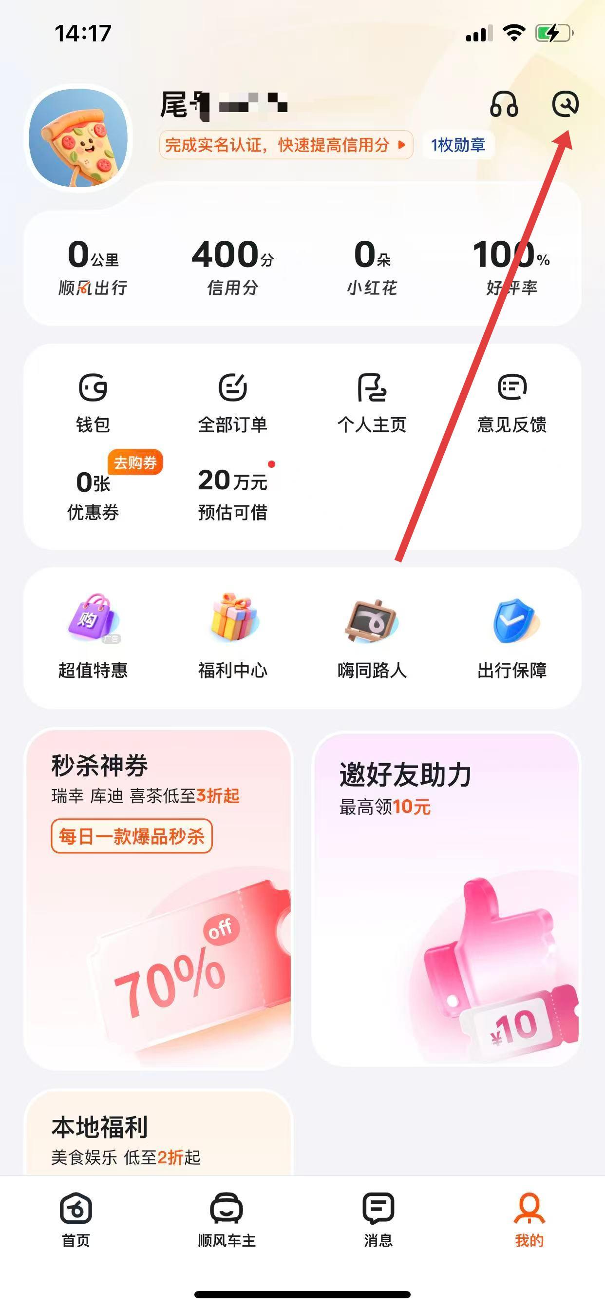 1、打開嘀嗒出行App,進(jìn)入我的,點(diǎn)擊類似齒輪的設(shè)置圖標(biāo),進(jìn)入設(shè)置頁面。