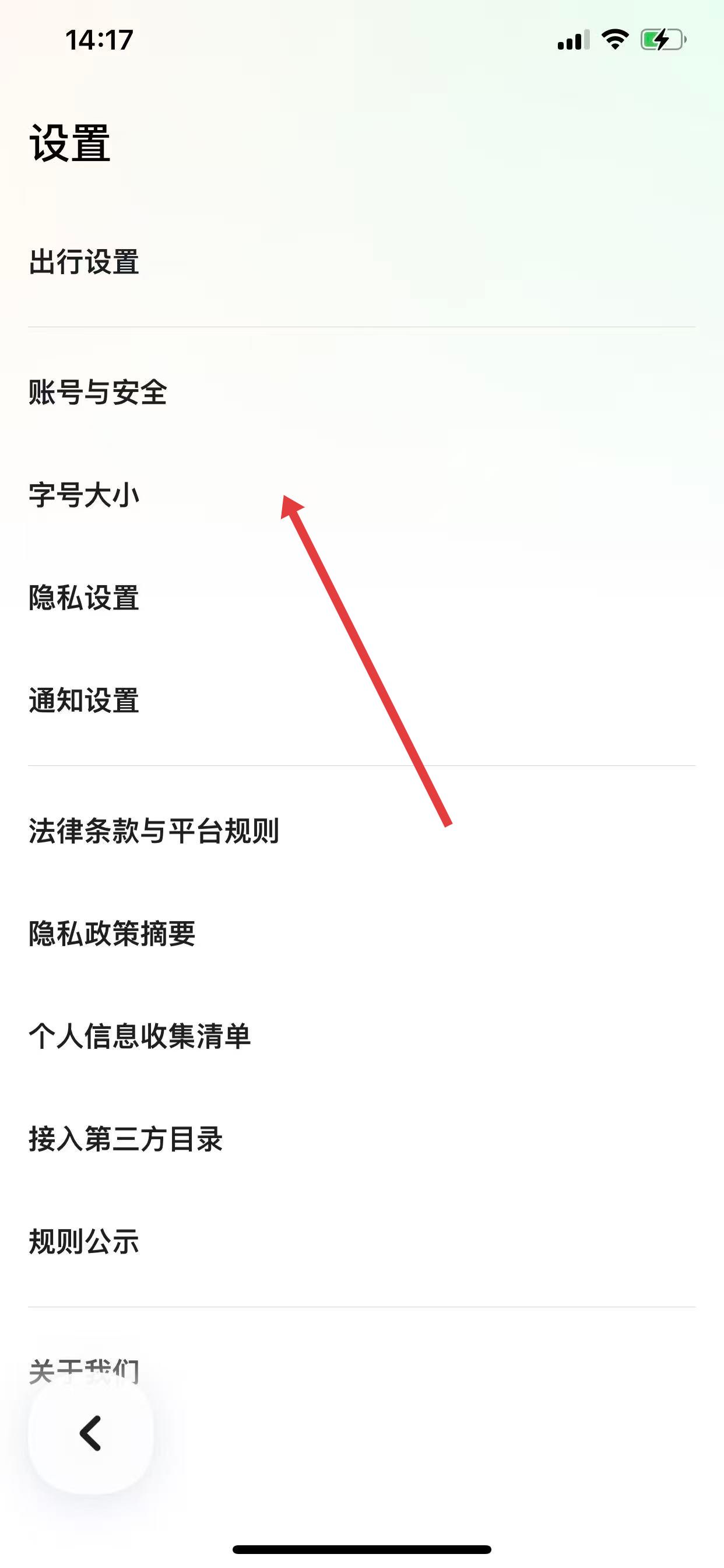 2、在設(shè)置頁面里,找到字號(hào)大小選項(xiàng)并點(diǎn)擊進(jìn)入。