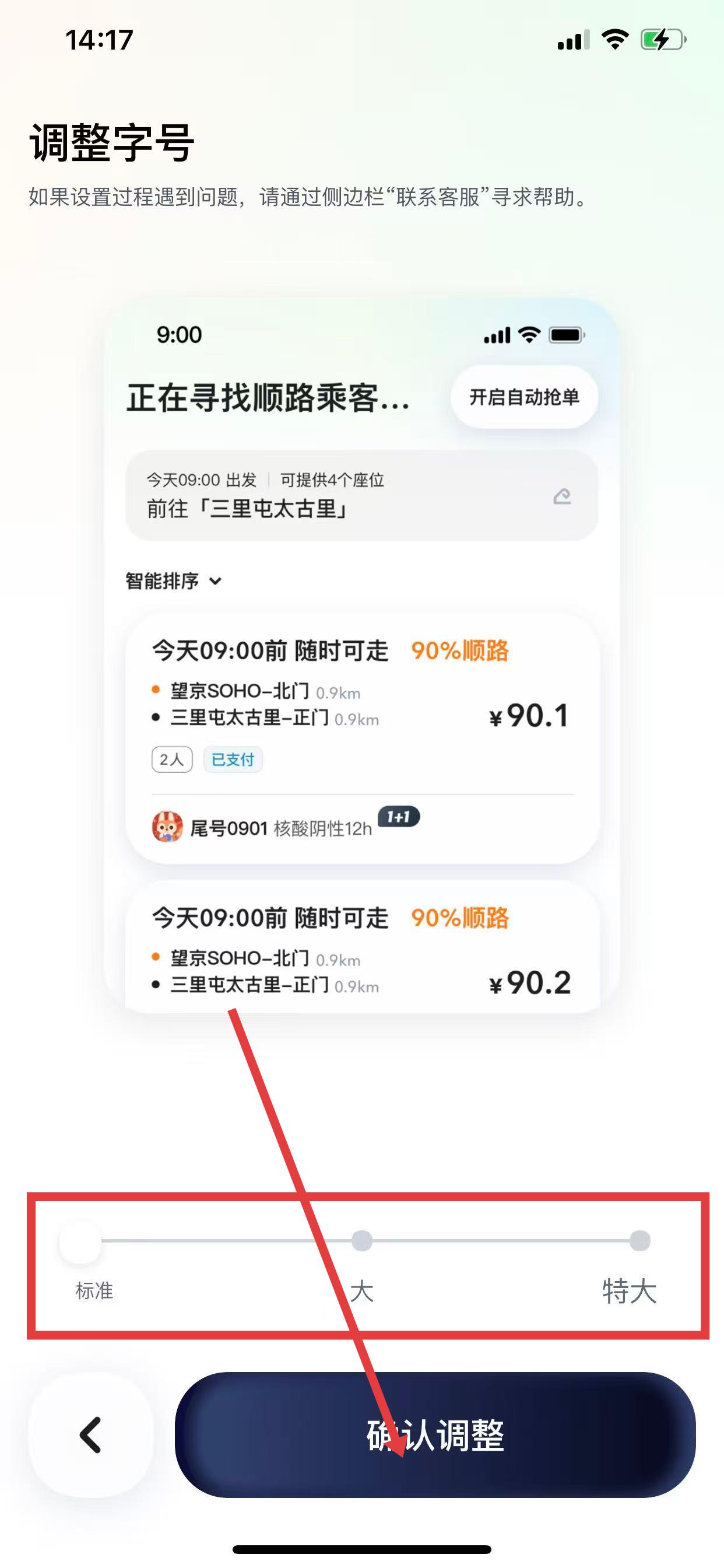 3、通過滑動(dòng)底部的字號(hào)調(diào)節(jié)條選擇合適字號(hào),點(diǎn)擊確認(rèn)調(diào)整完成設(shè)置。