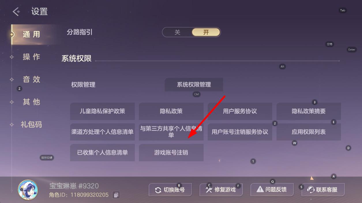 2、在設(shè)置頁(yè)面的通用分類下,下滑找到游戲賬號(hào)注銷選項(xiàng),點(diǎn)擊進(jìn)入賬號(hào)注銷流程頁(yè)面。