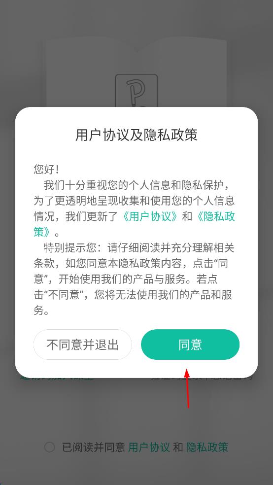 1、打開某學(xué)習(xí)軟件,在彈出的用戶協(xié)議及隱私政策提示框中,點擊同意按鈕,進入登錄界面。