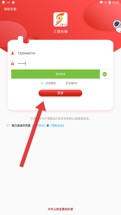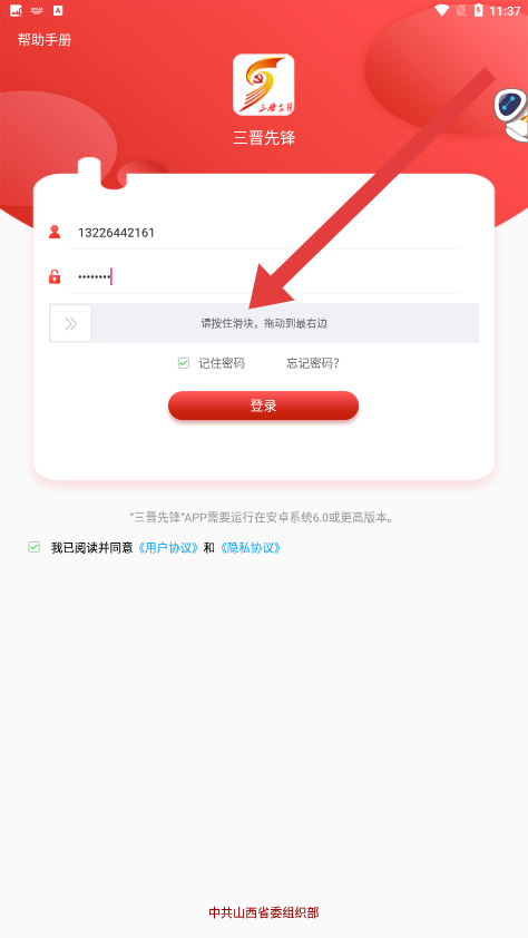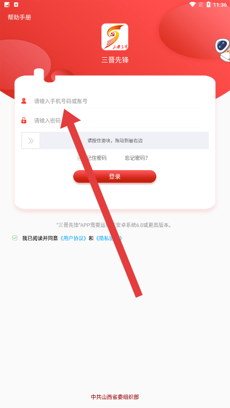 1、在三晉先鋒登錄頁面中,點擊輸入框輸入手機號進行登錄操作。