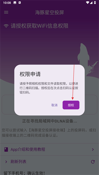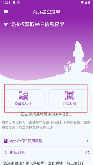 1、打開海豚星空投屏應(yīng)用,可選擇投屏碼認證或掃碼認證進行設(shè)備認證。