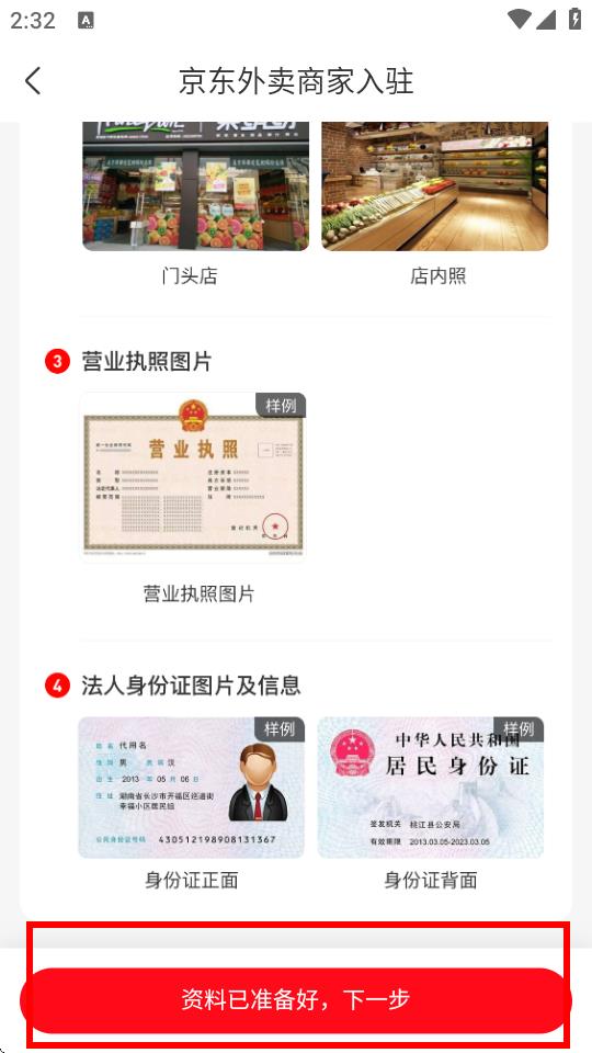 3、進(jìn)入京東外賣商家入駐頁(yè)面,按要求準(zhǔn)備好門頭店照片、店內(nèi)照、營(yíng)業(yè)執(zhí)照?qǐng)D片、法人身份證圖片等資料,點(diǎn)擊資料已準(zhǔn)備好,下一步。