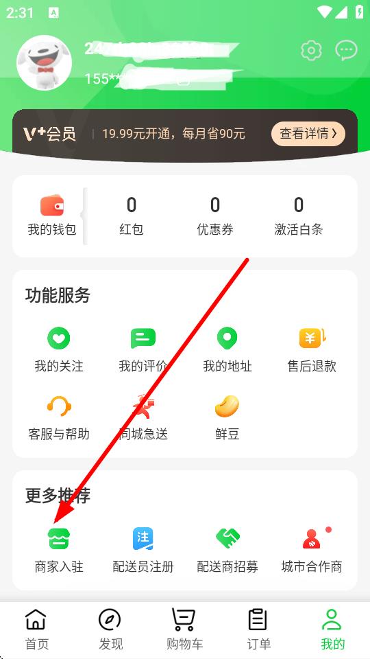 2、在我的頁(yè)面下方更多推薦欄里,點(diǎn)擊商家入駐。