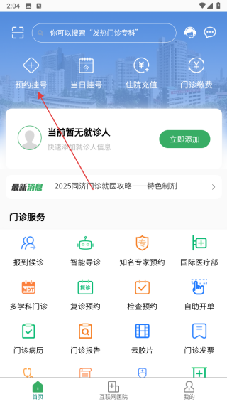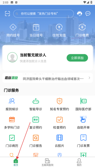 1、打開(kāi)掌上同濟(jì)醫(yī)院APP進(jìn)入首頁(yè),若尚未添加就診人信息,點(diǎn)立即添加按鈕完成添加,有就診人信息則直接操作下一步,可瀏覽最新消息了解。