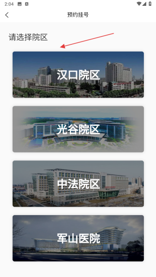 3、進(jìn)入預(yù)約掛號(hào)頁(yè)面后,選擇院區(qū),比如漢口院區(qū)、光谷院區(qū)等,選定院區(qū)后,按提示選擇科室、醫(yī)生、就診時(shí)間,確認(rèn)信息無(wú)誤后提交掛號(hào)訂單。