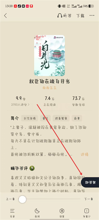 3、在小說閱讀頁面,點擊屏幕右側(cè)的加書架按鈕。