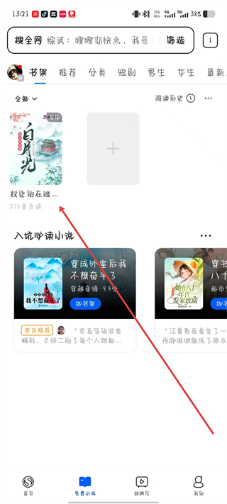 4、點擊后自動跳轉(zhuǎn)到免費小說頁面的書架板塊,即可查看。