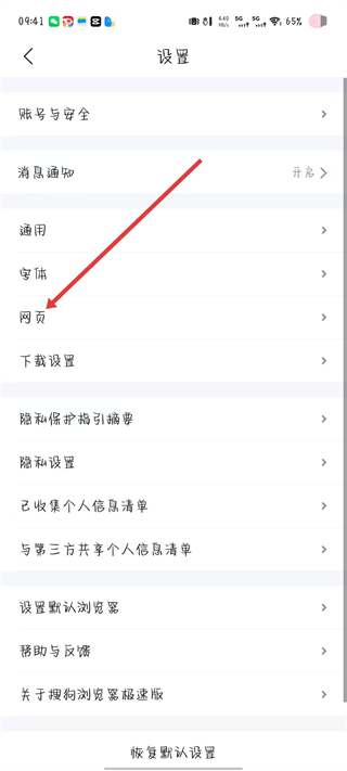 3、進入設(shè)置界面之后,選擇網(wǎng)頁的選項,進入網(wǎng)頁相關(guān)的設(shè)置頁面。