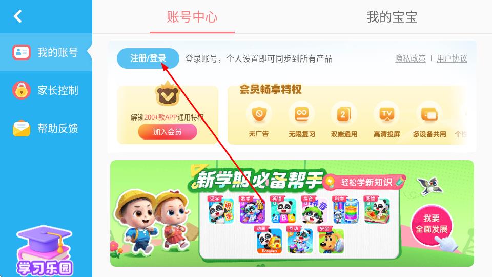2、進(jìn)入賬號(hào)中心頁(yè)面后,點(diǎn)擊注冊(cè)/登錄按鈕。