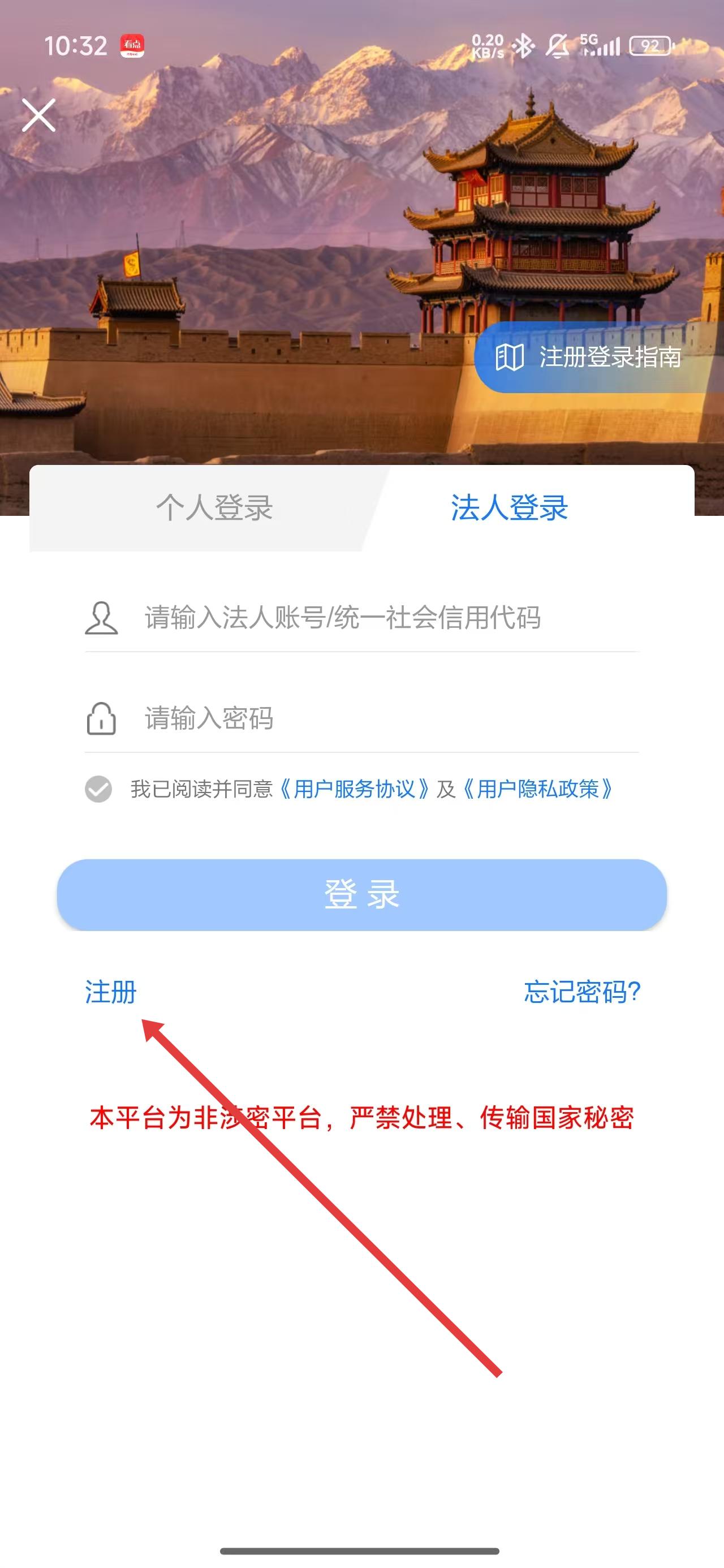 2、在登錄頁(yè)面中選擇法人登錄,若沒(méi)有賬號(hào)點(diǎn)擊下方注冊(cè)按鈕進(jìn)行注冊(cè)。
