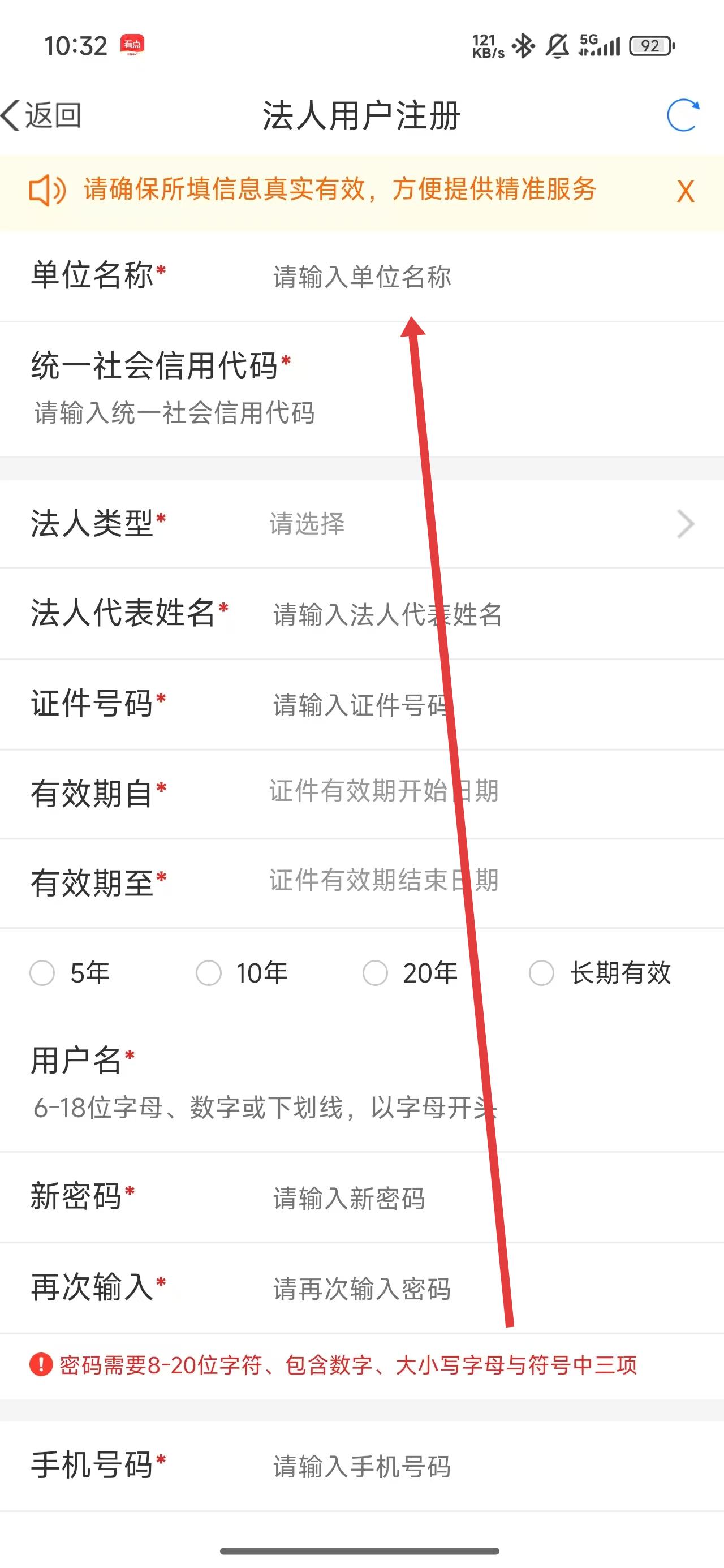 3、在法人用戶注冊(cè)頁(yè)面中,可以點(diǎn)擊輸入框輸入單位名稱等信息,執(zhí)行注冊(cè)操作。