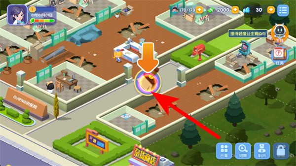 1、在萌趣醫(yī)院游戲界面,點(diǎn)擊建筑升級標(biāo)識,對醫(yī)院建筑進(jìn)行升級,提升醫(yī)院設(shè)施水平。