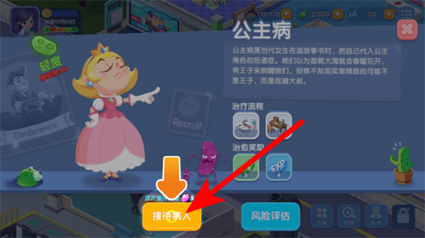 3、當(dāng)有特殊病人如公主病患者時(shí),點(diǎn)擊接待病人按鈕,開始對其進(jìn)行治療。