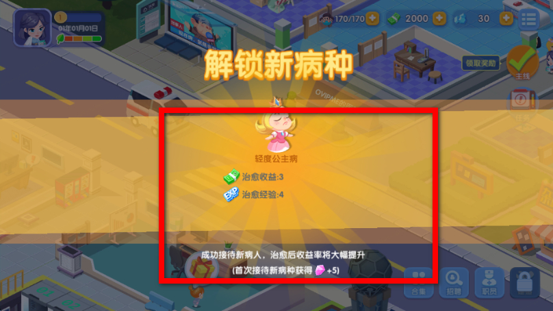 4、按照治療流程完成病人治療,可獲得治愈獎勵,如道具、經(jīng)驗(yàn)等,助力醫(yī)院發(fā)展。