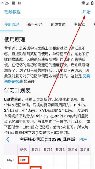 1、打開List背單詞app,在初始頁面點(diǎn)擊右上角的開始按鈕。